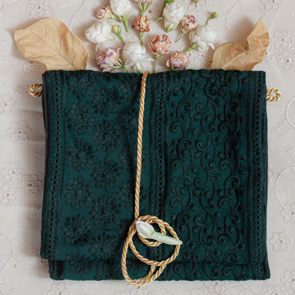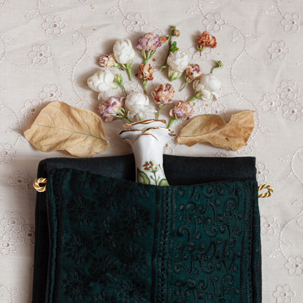 تغلف المزهرية بحقيبة فاخرة ، خيطت يدويَّا بقماش الركاما الأخضر المبطن