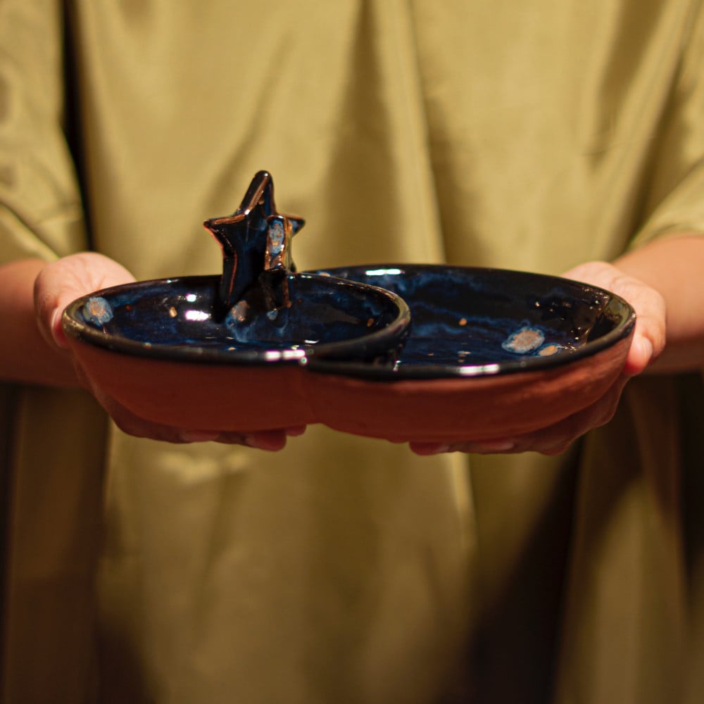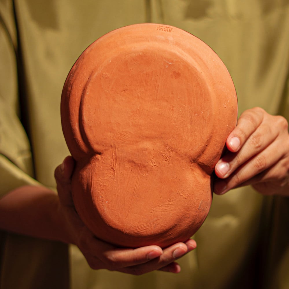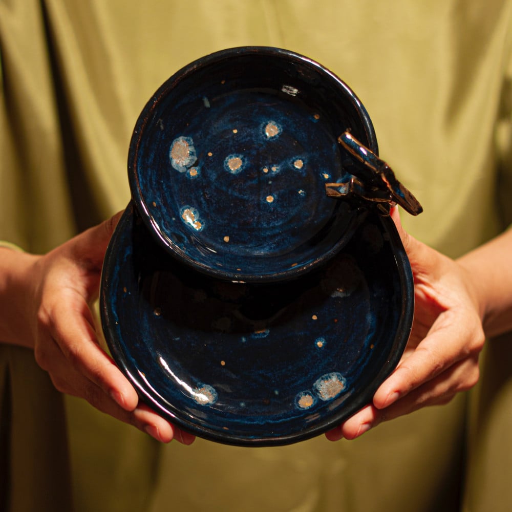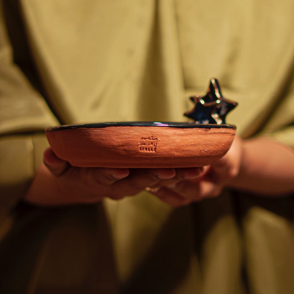 تم تشكيلها يدويًا من الطين الأحمر وتزجيجها من الداخل باللون الأزرق المسوَد، تظهر فيه بقع لونية لامعة من اللون الذهبي .