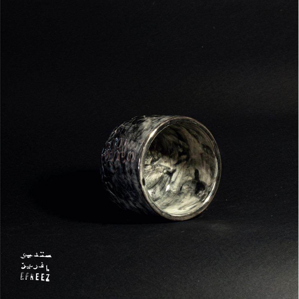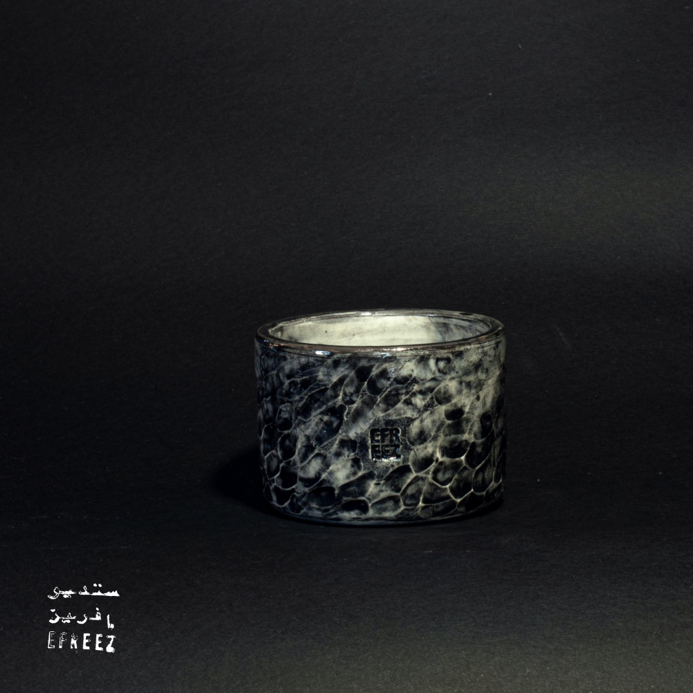 اللون : أسود وأبيض ورمادي / ، مزجج بالكامل ما عدا القاعدة / مُزيَّن بالفضة من الأعلى وعلى يد الكوب