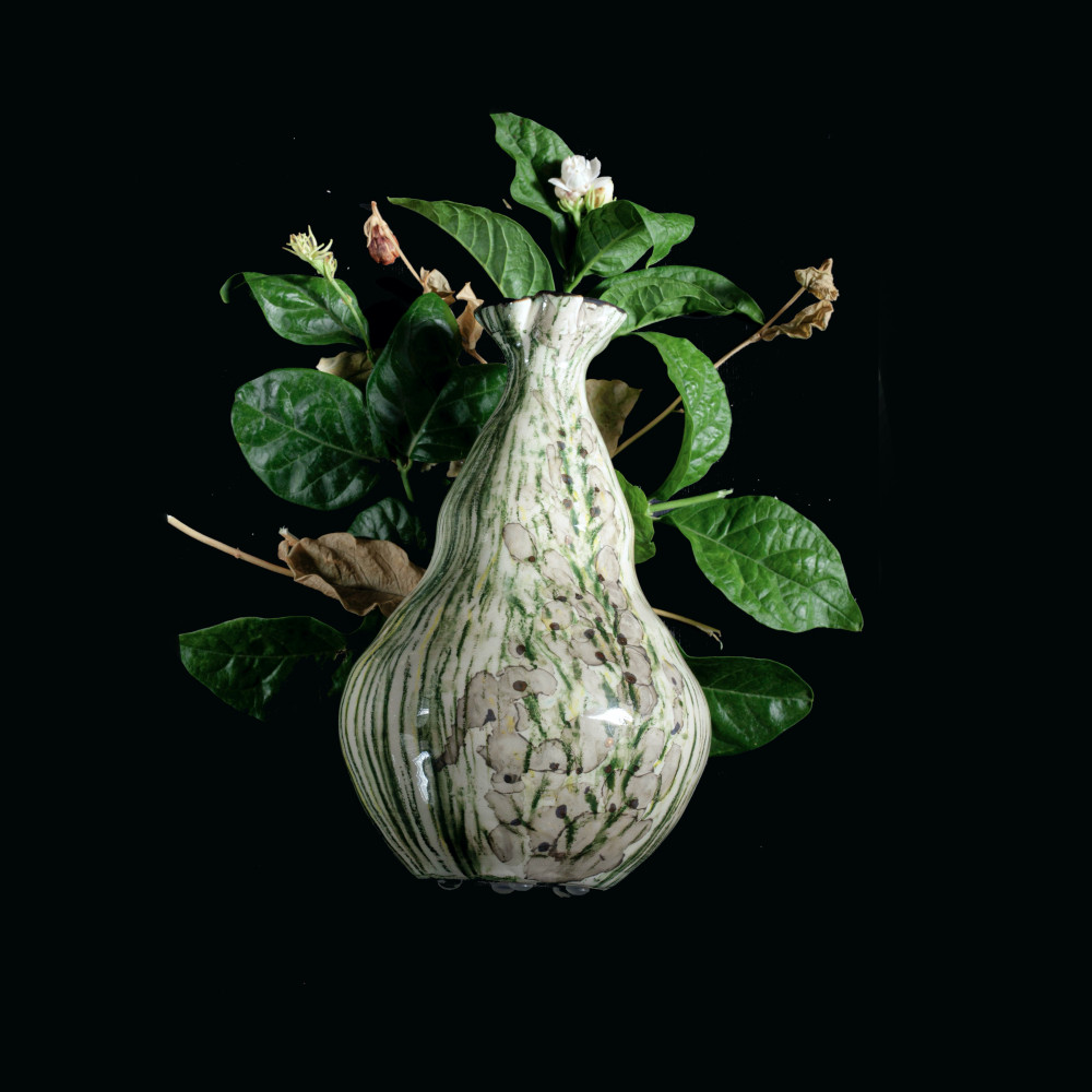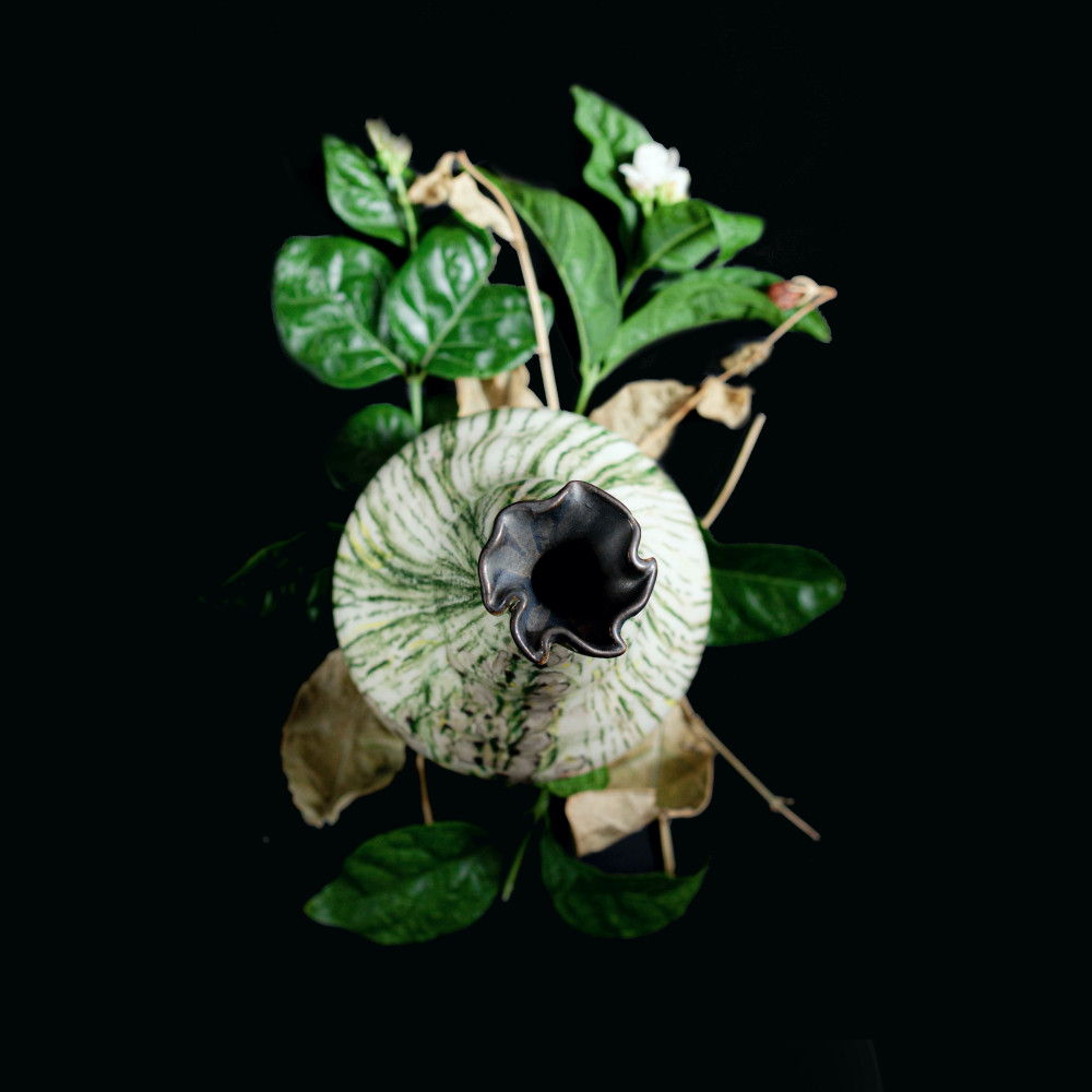 تغلف المزهرية بحقيبة فاخرة ، خِيطت يدويَّا بقماش الركاما الأخضر المبطن
