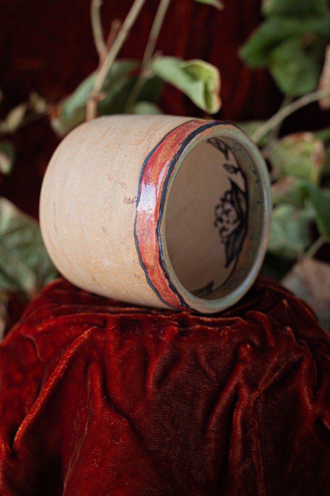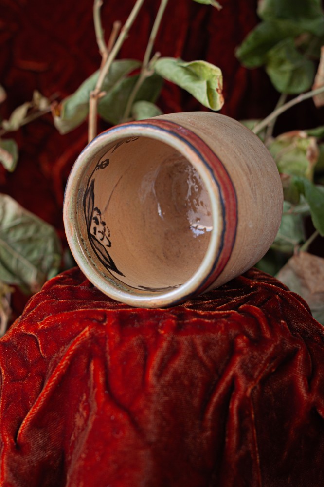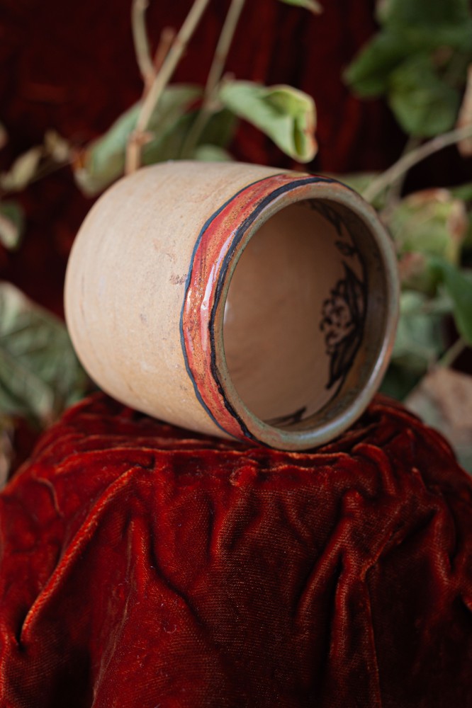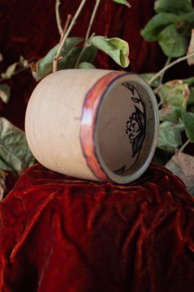 صممت مجموعة من الأكواب من الطين الأحمر الرخامي ، مع إطار أحمر وأخضر وزخارف مرسومة يدويآ تعكس زهرة الفل .