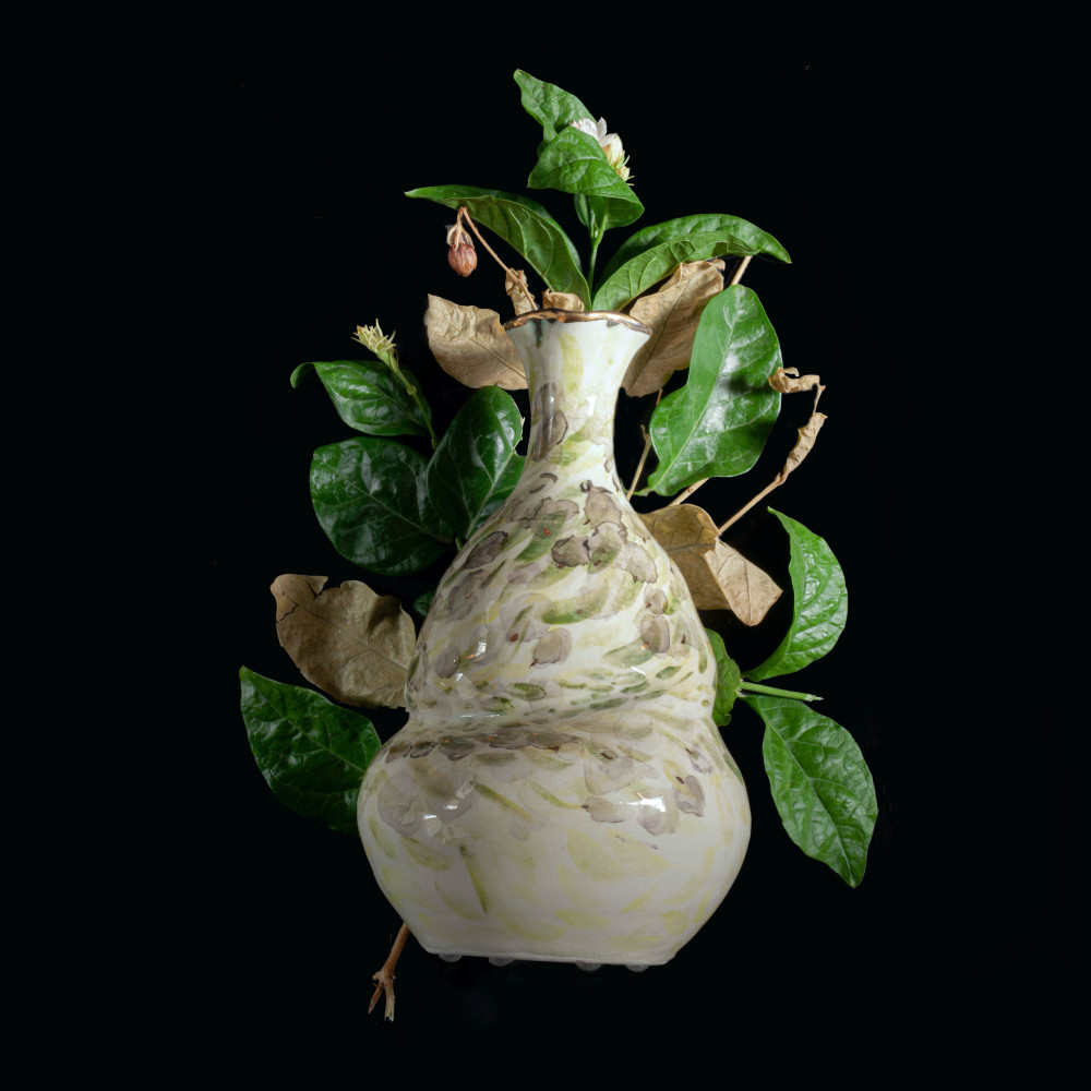 تغلف المزهرية بحقيبة فاخرة ، خِيطت يدويَّا بقماش الركاما الأخضر المبطن