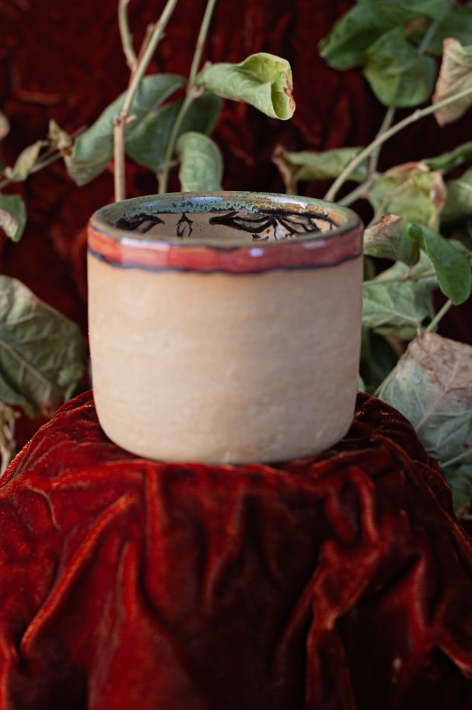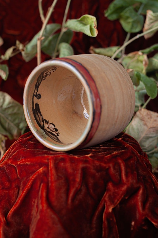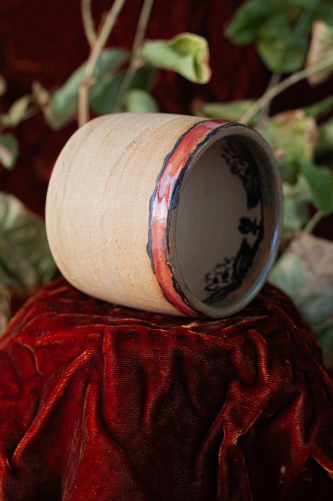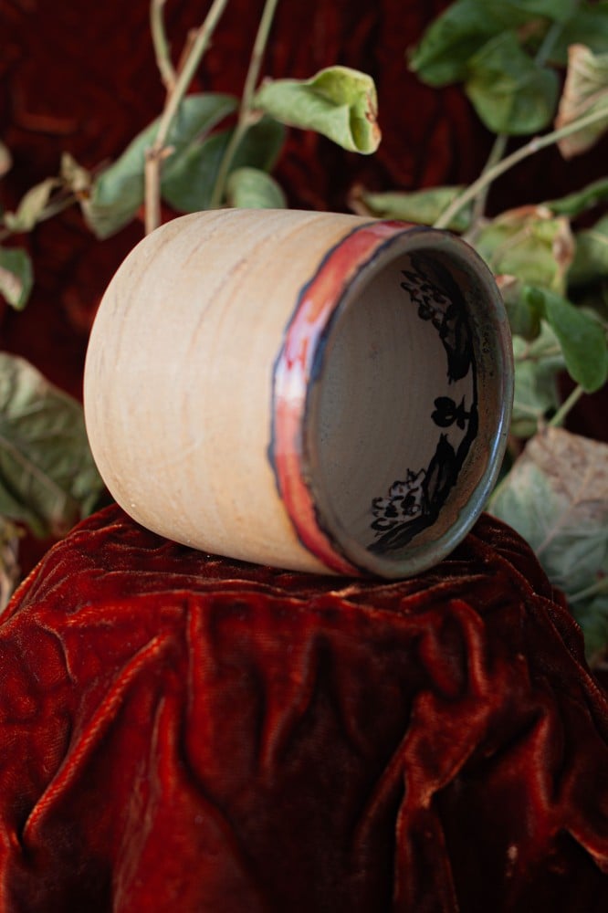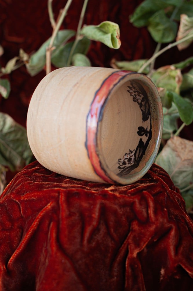 صممت مجموعة من الأكواب من الطين الأحمر الرخامي ، مع إطار أحمر وأخضر وزخارف مرسومة يدويآ تعكس زهرة الفل .