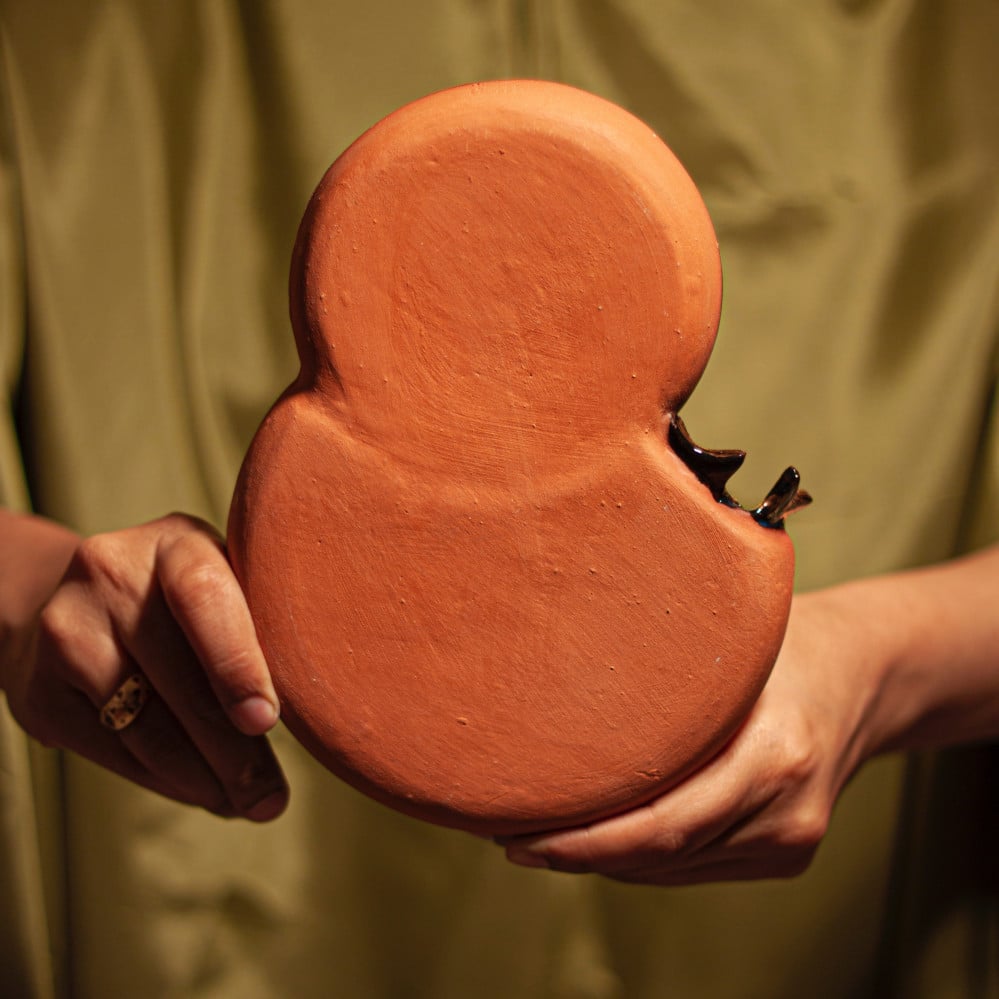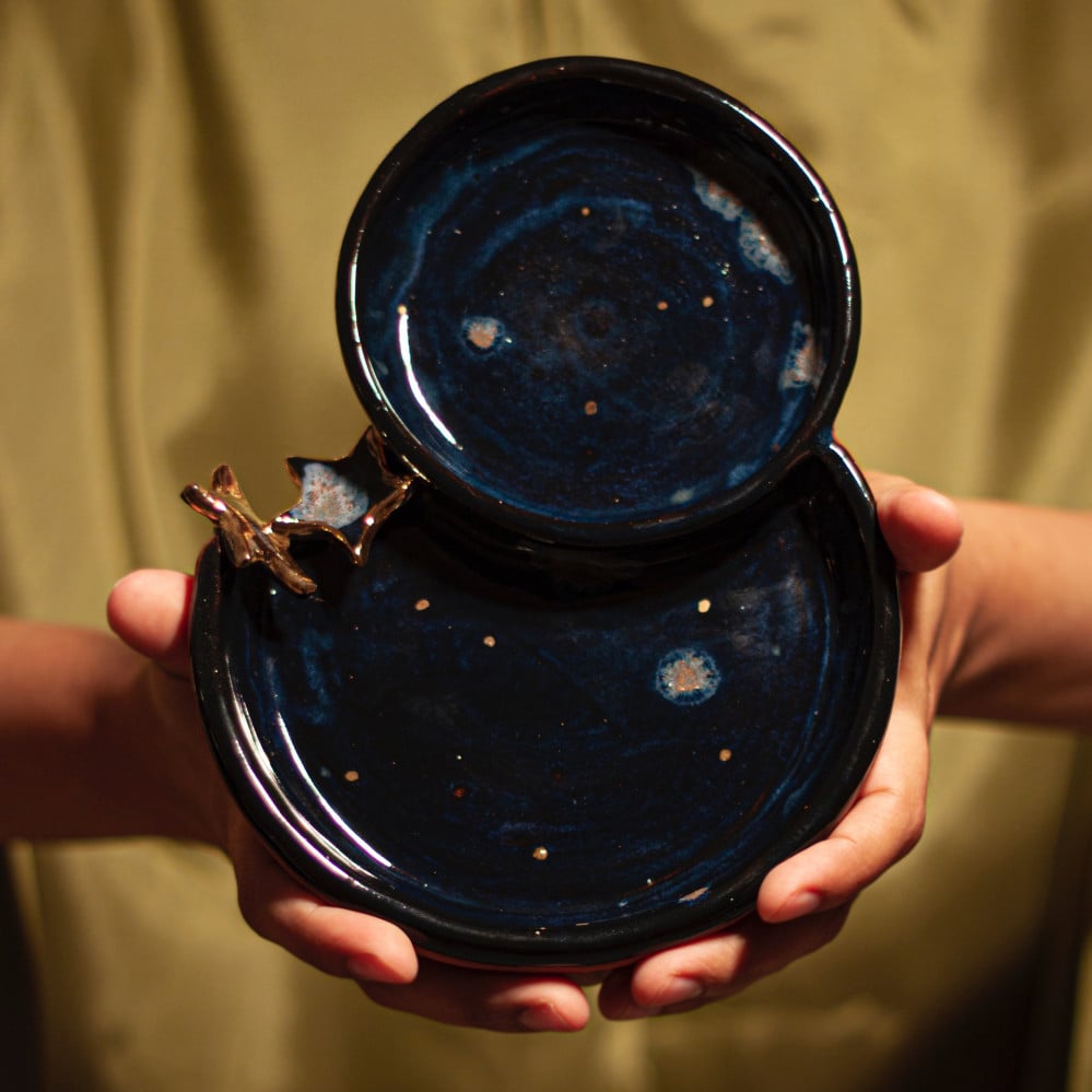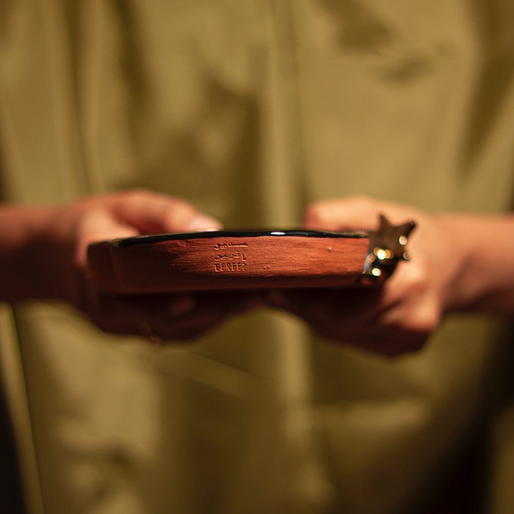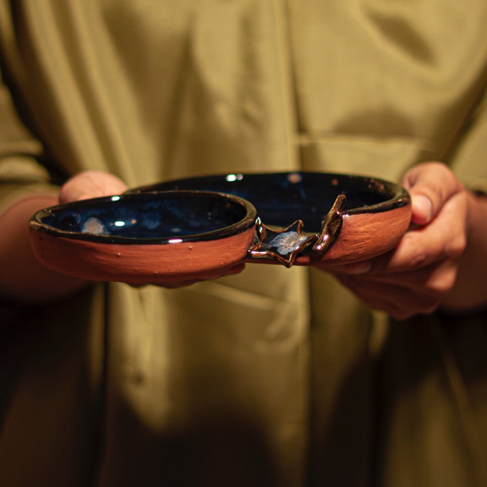 تم تشكيلها يدويًا من الطين الأحمر وتزجيجها من الداخل باللون الأزرق المسوَد، تظهر فيه بقع لونية لامعة من اللون الذهبي .
